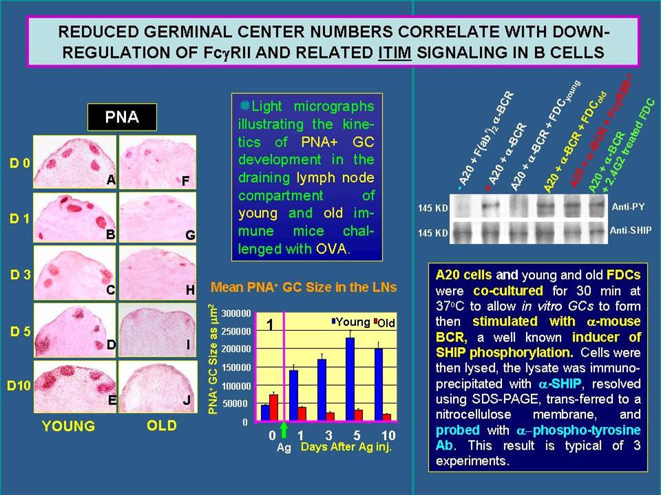 The left panel above shows representative sections of draining lymph nodes in young and old mice labeled with PNA-HRP for developing germinal centers from days 0 through 10 after Ag-ic challenge. Mean PNA+ germinal center size was determined and shown as bar graphs above (graph 1). Note that in old mice the Ag induced GC development is arrested and declines. This decline also parallels the downregulation of FcgRIIB and Ag-Ab trapping (see Pannel B). P<0.005 The panel on the right shows that incubation of B cells with young FDCs(y) reduced ITIM signaling as indicated by reduced SHIP phosphorylation when compared with B cells stimulated with anti-BCR. However, old FDCs(o) did not block SHIP phosphorylation in stimulated B cells. FDCs from FcgRII KO mice were even less effective.